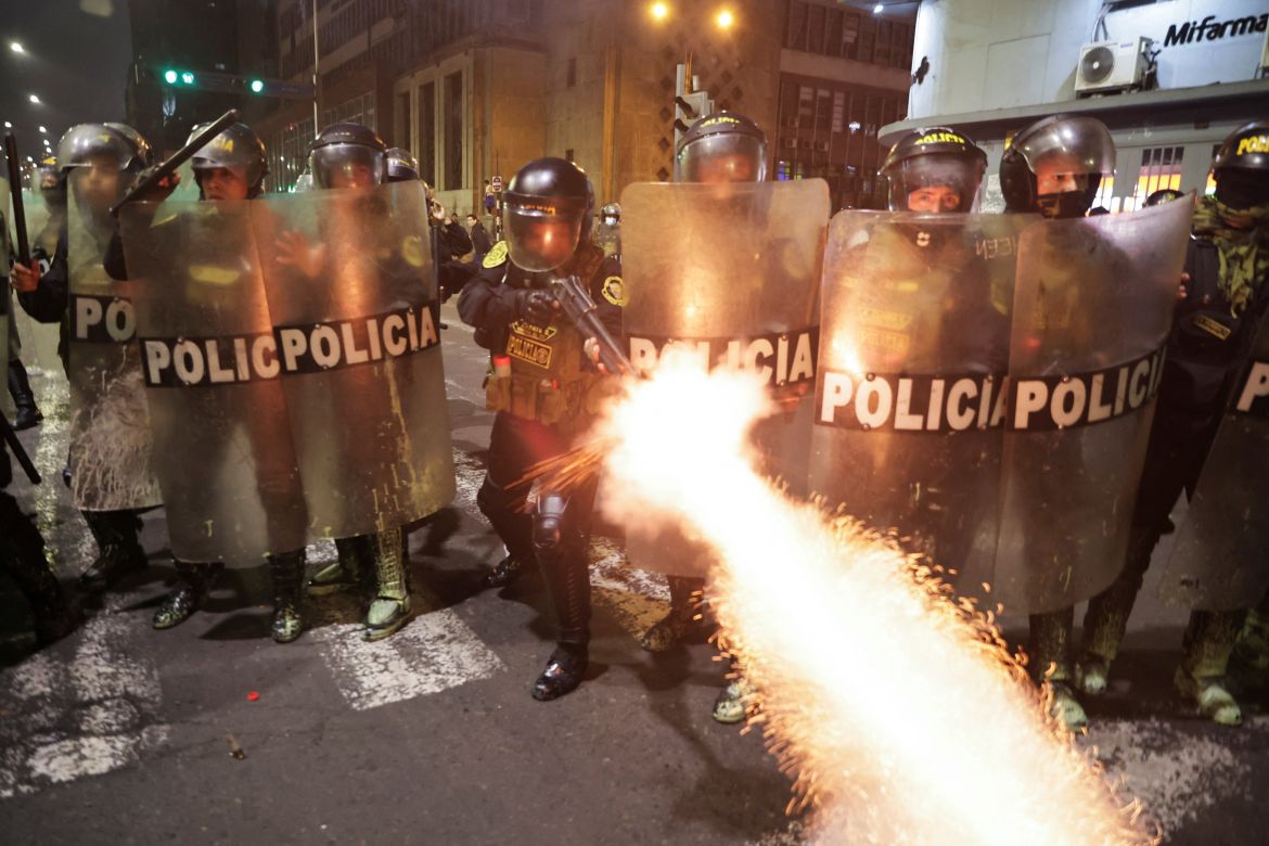 A police officer fires a nonlethal munition during a demonstration organised by a youth collective called “Generation Z” in Lima, Peru. [Sebastian Castaneda/Reuters]