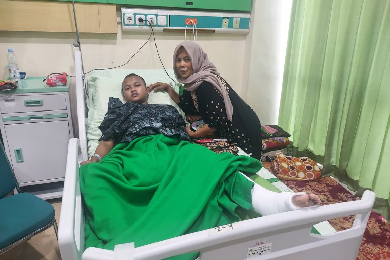 Muhammad fell several times as he fled and was hit by debris, including large chunks of crumbling cement. Fuelled by adrenaline, he said he felt “nothing at the time” but once he was outside and had collapsed on the ground, he realised his leg was broken. He had also fractured his shoulder so severely that doctors at Siti Fajar Hospital in Sidoarjo had to insert a metal pin to hold it together.
