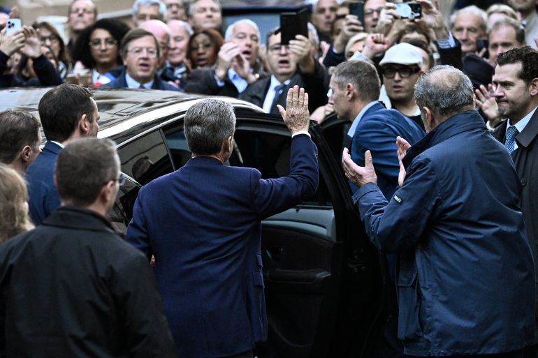 France’s former president Nicolas Sarkozy, centre, waves to his supporters as he leaves his residence to present himself to La Sante prison after being convicted of criminal conspiracy over a plan for late Libyan dictator Muammar Gaddafi to fund his 2007 electoral campaign, in Paris, on October 21, 2025 [AFP]