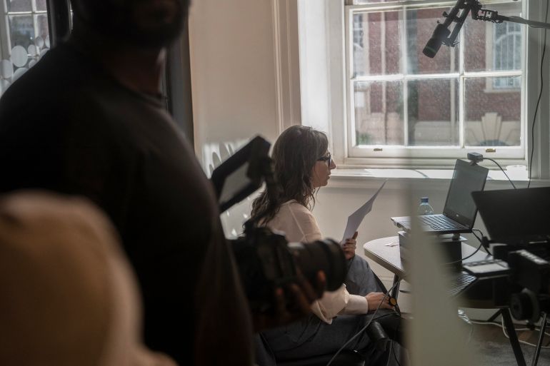 United Nations special rapporteur on the occupied Palestinian territory Francesca Albanese, right, delivered her presentation of her latest report to the UN General Assembly remotely, at the Desmond and Leah Tutu Legacy Foundation, in Cape Town, South Africa, on 28 October, 2025 [Rodger Bosch/AFP]