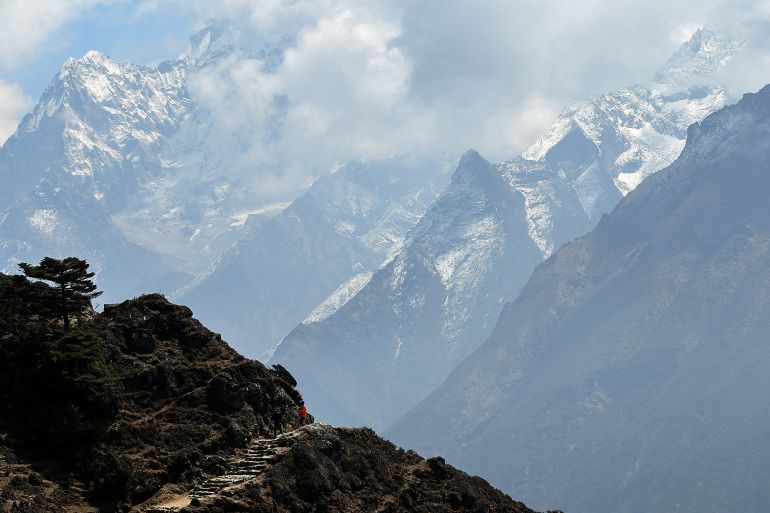 Trekkers walk along a path in Syangboche in the Everest region, some 140km (87 miles) northeast of Kathmandu, in 2018 [File: Prakash Mathema/AFP]