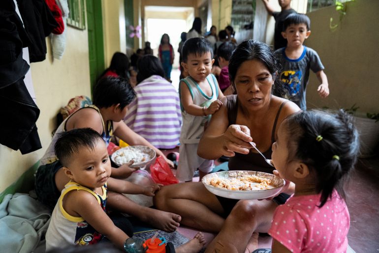 A woman feeds children at an evacuation centre in Manila as the Philippines prepares for Super Typhoon Fung-wong. [Lisa Marie David/Reuters]