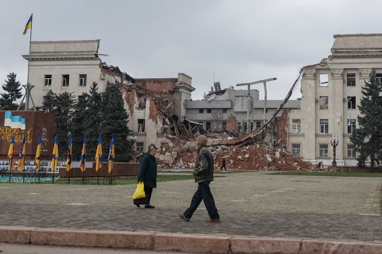 People walk near a building hit during a Russian military strike, in the front line city of Kherson, Ukraine, on Tuesday [Nina Liashonok/Reuters]