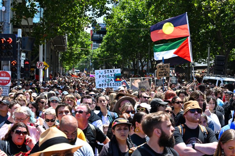 Protesters march during an Invasion Day Protest on January 26, 2023 in Melbourne, Australia [Alexi J Rosenfeld/Getty Images]