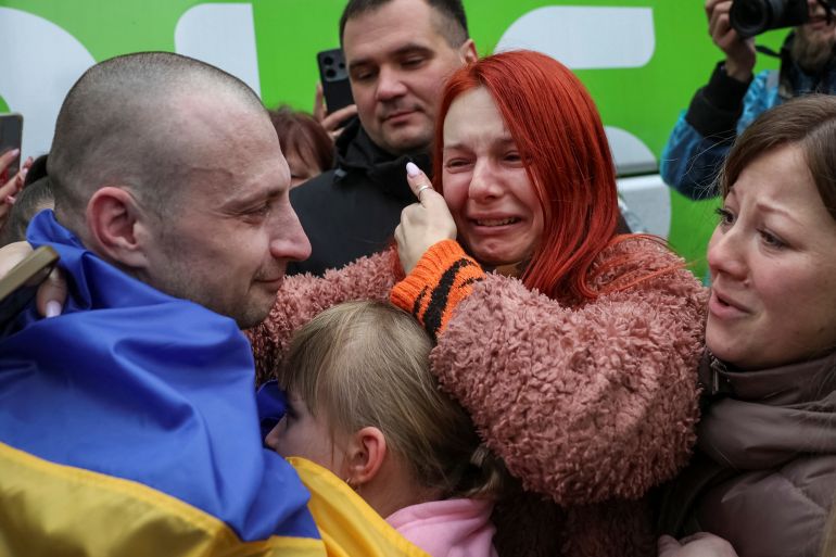 A freed Ukrainian prisoner of war embraces his relatives after a swap at an undisclosed location in Ukraine on October 2, 2025.[File: Anatolii Stepanov/Reuters]