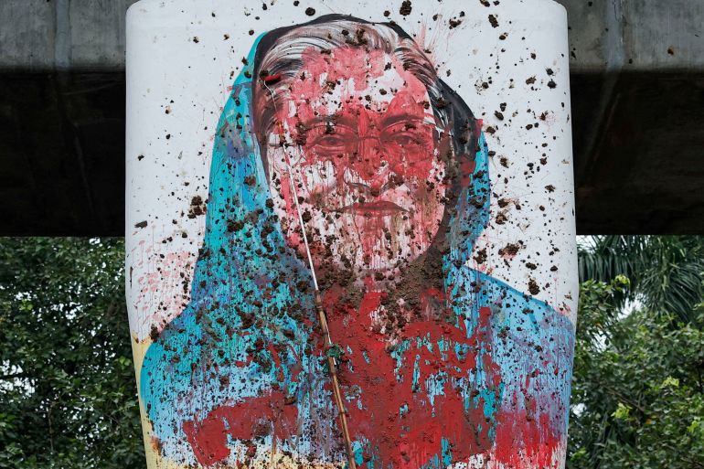 A mural of Bangladeshi Prime Minister Sheikh Hasina was vandalised as students demanded her resignation at the University of Dhaka on August 3, 2024 [Mohammad Ponir Hossain/Reuters]