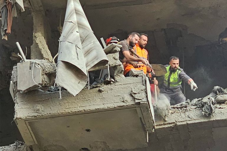 Rescuers search for survivors at the site of an Israeli air strike that targeted a residential building in southern Beirut’s Haret Hreik neighbourhood [AFP]