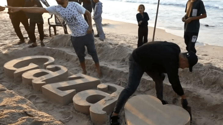 Yazid Abu Jarad and his team carve letters in the sand using tape measures, drawing a crowd, including children scarred by the relentless Israeli attacks, which have continued despite last month’s ceasefire with Hamas brokered by the United States and mediators.