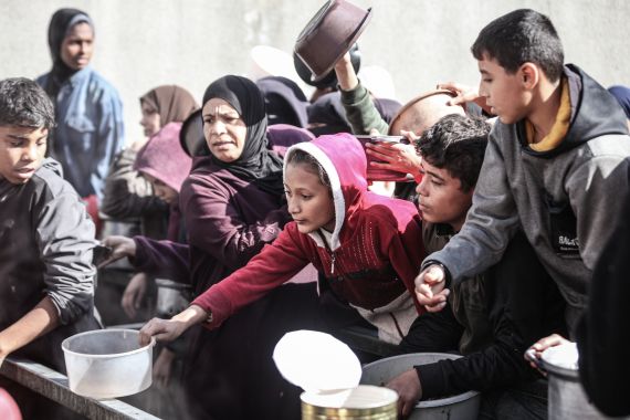Palestinians, including children, who are struggling to access food gather to receive hot meals distributed by a charity organisation at Nuseirat refugee camp in Gaza City, Gaza on December 30, 2025 [Abed Rahim Khatib/Anadolu]