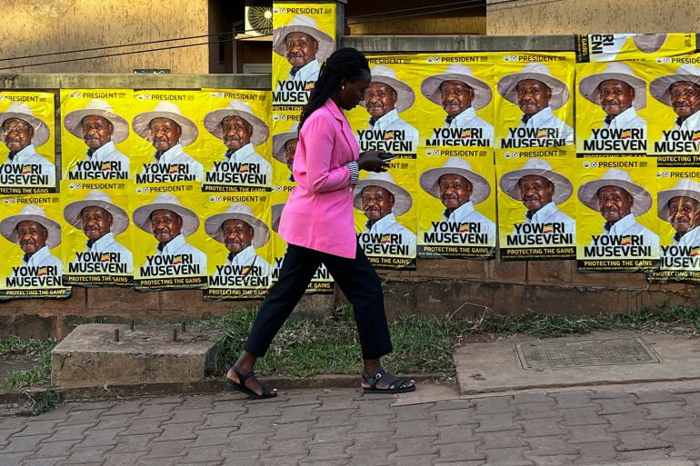 A woman uses a mobile phone as she walks past campaign posters for Yoweri Museveni, Uganda’s president and presidential candidate of the ruling National Resistance Movement (NRM), ahead of the general election in Kampala, Uganda, January 14, 2026 [Thomas Mukoya/Reuters]
