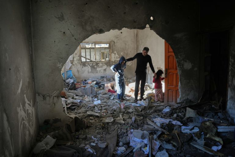 Palestinians inspect the rubble of the al-Hawli family home, destroyed in an Israeli strike in Deir el-Balah, in the central Gaza Strip, on 16 January, 2026 [Abdel Kareem Hana/AP Photo]