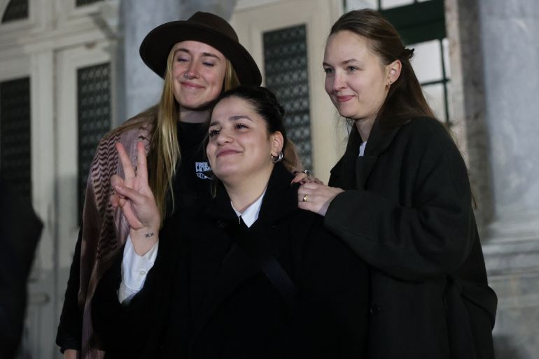 Syrian competitive swimmer and activist Sarah Mardini, centre, as she leaves the court in Mytilene, Lesbos, Greece, on Thursday [Manolis Lagoutaris/AFP]
