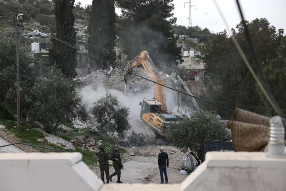 Israeli soldiers secure the area as a bulldozer demolishes Palestinian-owned homes in the village of Tarqumiyah, near the occupied West Bank city of Hebron on February 1, 2026 [Hazem Bader/AFP]