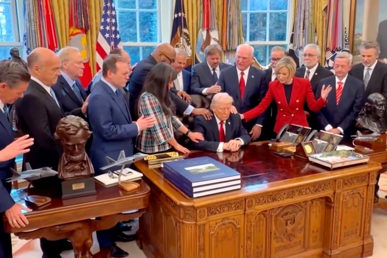 Christian pastors pray over US President Donald Trump in the Oval Office at the White House in Washington, in video released on March 5, 2026 [Still image from Reuters video]